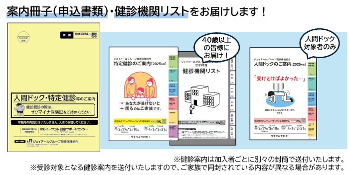 ※令和7年2月6日時点でJR健保に加入されている方へ送付いたします。それ以降に資格取得(任継継続を含む)された方については、手続き完了後から2か月程度で健診案内を発送いたします。なお、手続き後2か月が経過しても健診案内が届かない場合は、JR健保までお問合せください。