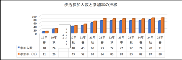 管区として初めて参加した2019年春には参加者がわずか10名、参加率11%という状況でしたが、その後参加者は年々増え続け、2022年春以降は参加者70名超、参加率8割超を維持しています。