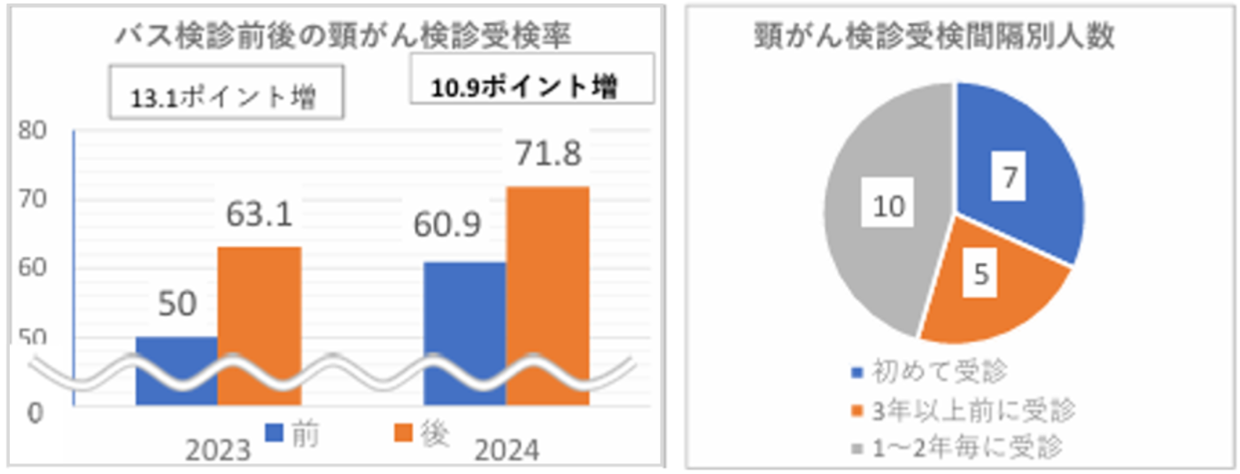 この取り組みにより、バス検診の前後で子宮頸がん検診の受検率は10.9ポイント向上し、改善に大きく貢献しました。