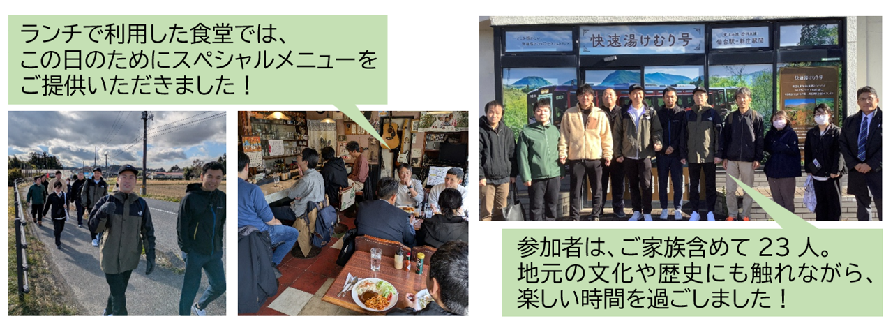 小牛田駅周辺の食堂ではスペシャルメニューをご提供いただくなど、地域との交流を深めるとともに、その魅力を再発見しました。美味しいものを食べ、参加者同士で会話をしながら歩くことで、心も身体も温まり、楽しみながら健康増進につなげることができました。
