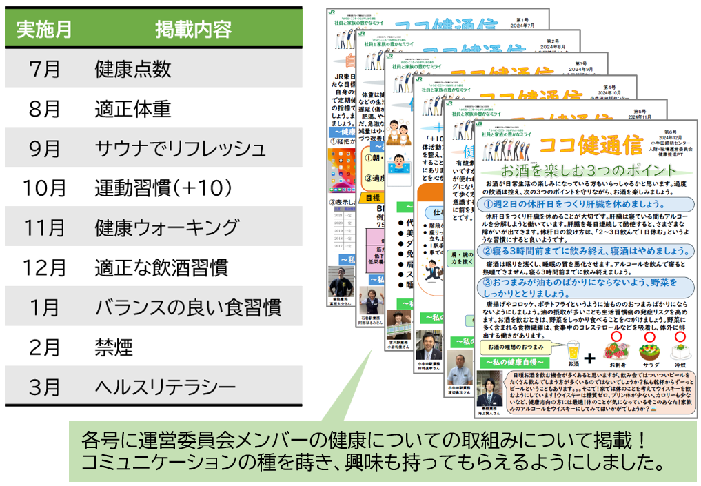 ココ健通信の「ココ」は小牛田の「コゴ」から名付けました。「JR東日本グループ健康ビジョン2029」の目標や季節感を踏まえながらテーマを選定し、できるだけ「難しい」内容にならないよう、「身近で読みたくなる」記事作成を意識しました。ココ健通信による情報発信・情報共有を通じて、職場のコミュニケーションの活性化と健康意識・ヘルスリテラシーの向上を目指しています。