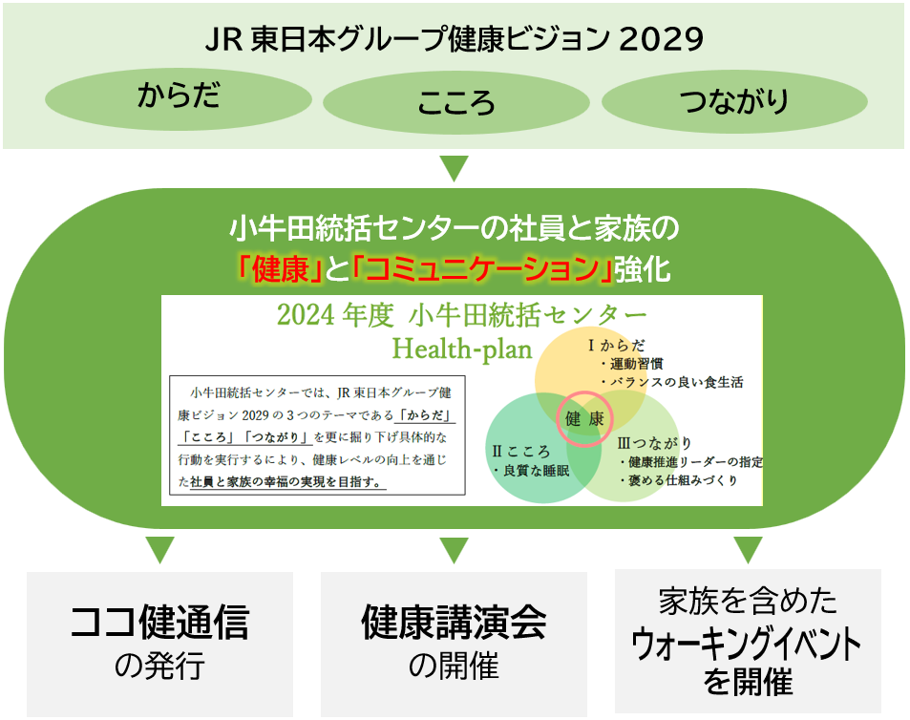 JR東日本では、「JR東日本グループ健康ビジョン2029」を策定し、健康づくりを「からだ」「こころ」「つながり」の3つの視点から推進することを重要な柱としています。これを受けて、小牛田統括センターにおいても独自の取組み方針として「小牛田統括センター Health-plan」を策定し、社員一人ひとりの健康増進と職場コミュニケーションの活性化を目的に、「つながり」を強く意識したさまざまな取組みを進めてきました。