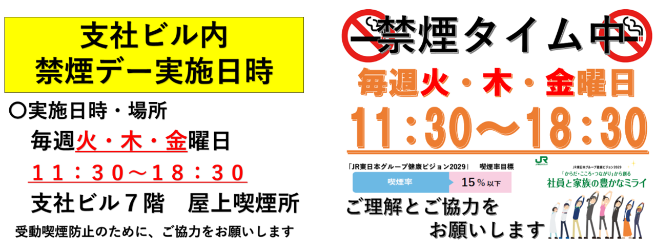 これまで長野支社ビルでは、毎月22日を「禁煙デー」と設定し、喫煙率の低減に向けた取組みを進めてきました。しかし、エレベーター内のニコチン残留による受動喫煙の課題や匂い、また、屋上が喫煙スペースとなっているため非喫煙社員が屋上スペースを利用しづらいといった課題がありました。