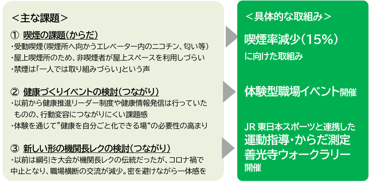 長野支社では、「JR東日本グループ健康ビジョン2029」の実現を目指して、これまで職場環境の改善や意識改革に取り組んできました。しかしその一方で、喫煙率の課題や生活習慣の偏り、そして社員が健康を意識するための“きっかけ”がまだ十分でないことなど、いくつかの課題が見え始めていました。さらに、健康づくりへの参加意欲に個人差があることも、取り組みを進めるうえでの悩みとなっていました。