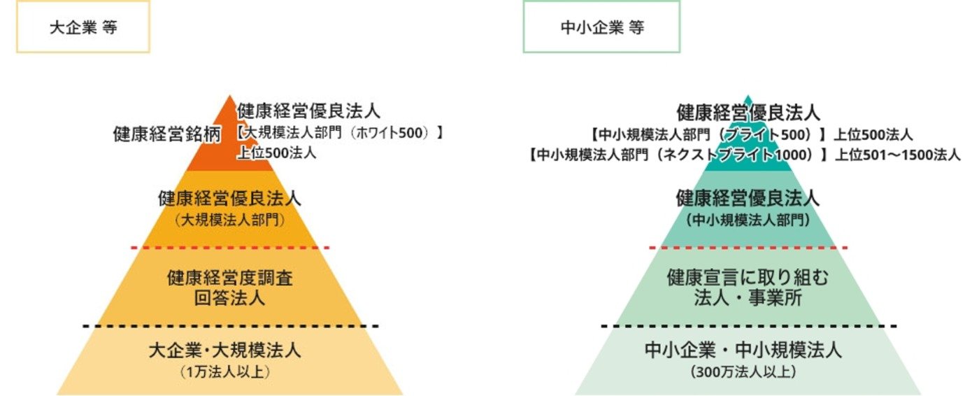 健康経営優良法人認定制度とは、特に優良な健康経営を実践している大企業や中小企業等の法人を「見える化」することで、従業員や求職者、関係企業や金融機関などから社会的な評価を受けることができる環境を整備することを目的に、日本健康会議が認定する顕彰制度です。「大規模法人部門」「中小規模法人部門」の2部門から構成されており、「大規模法人部門」の中でも上位500法人は「ホワイト500」、「中小規模法人部門」の上位500法人は「ブライト500」、「中小規模法人部門」の上位501法人~1500法人は「ネクストブライト1000」に認定されます。